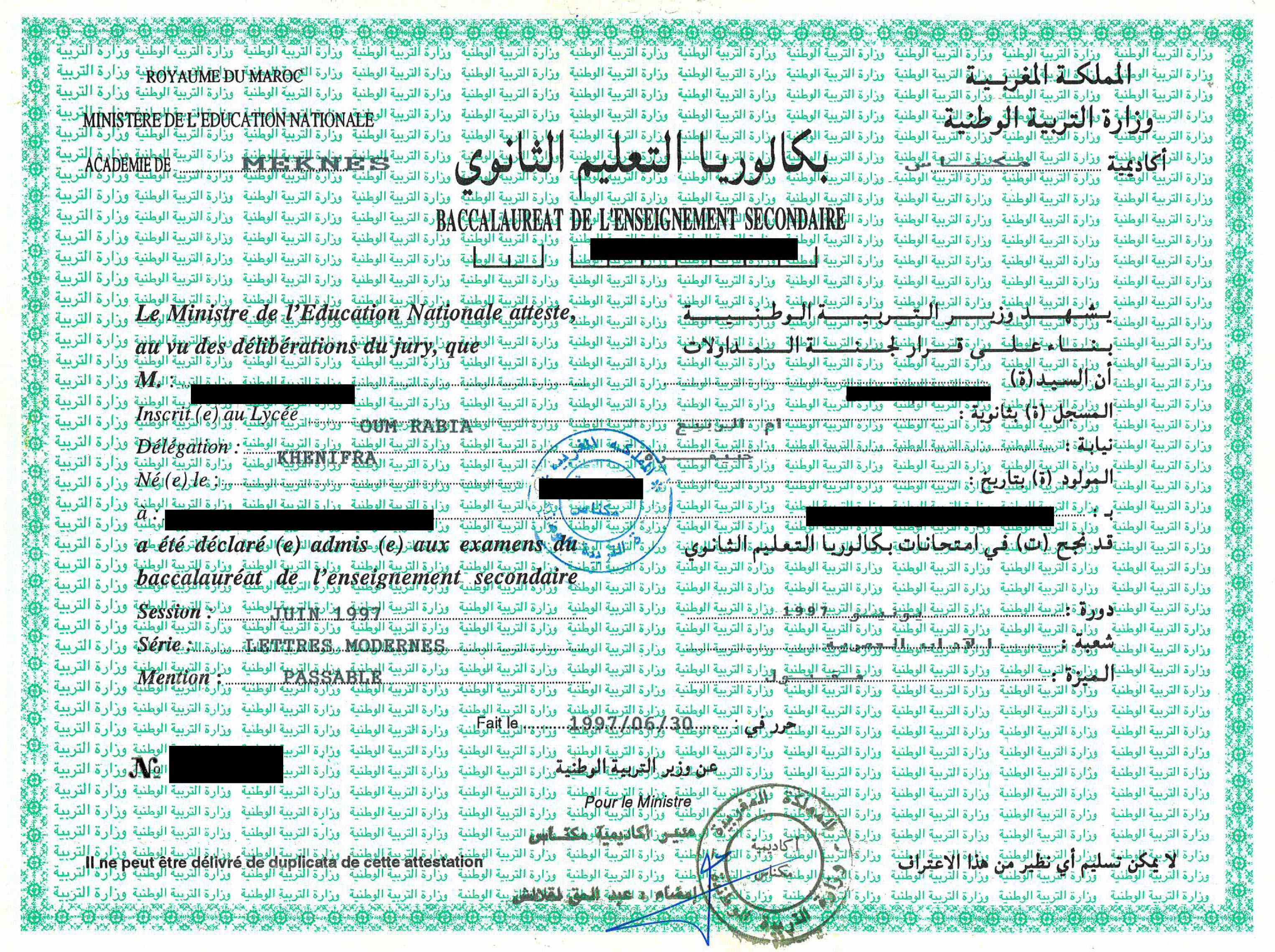 Option 2: Mail or bring your ORIGINAL Diplôme du Baccalauréat and Relevé de Notes to our office. The documents should be issued in French and/or Arabic and be issued by the Ministry of Education. (Scans, faxes, photocopies and notarized copies are not considered original documents and cannot be accepted.)