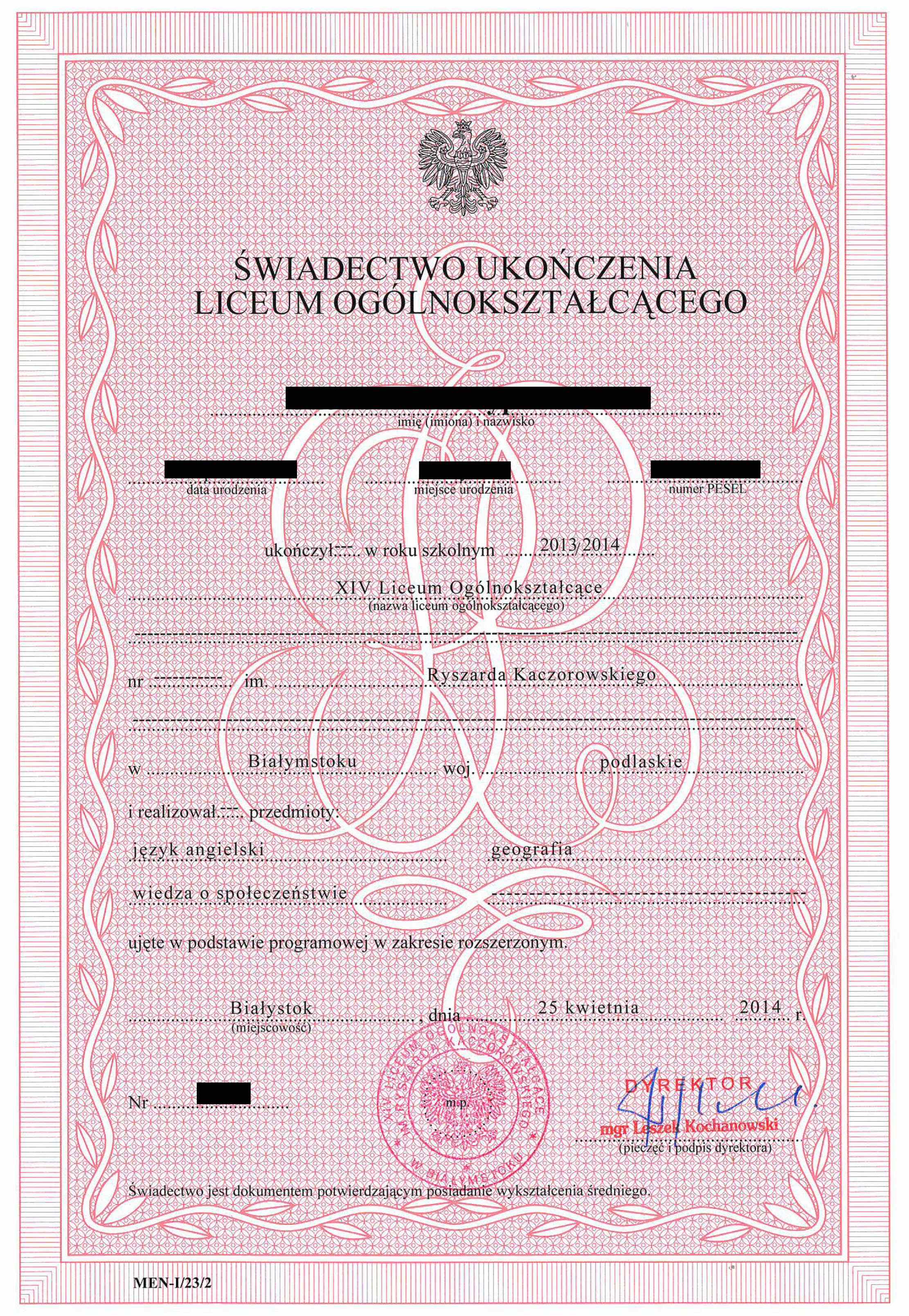 Świadectwo dojrzałości liceum (ogólnokształcącego, profilowanego, medycznego, ekonomicznego)