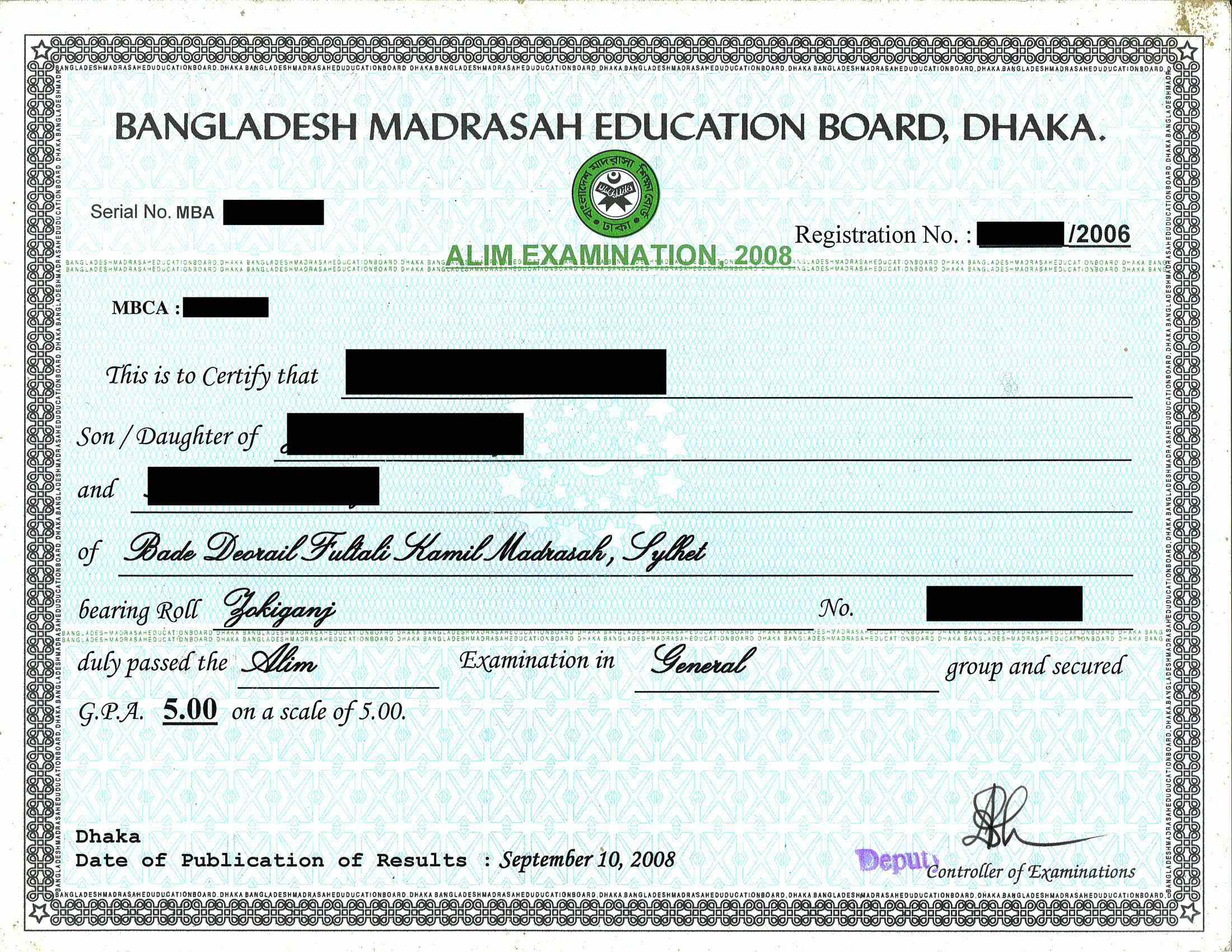 Certificate issued by the Board of Education
