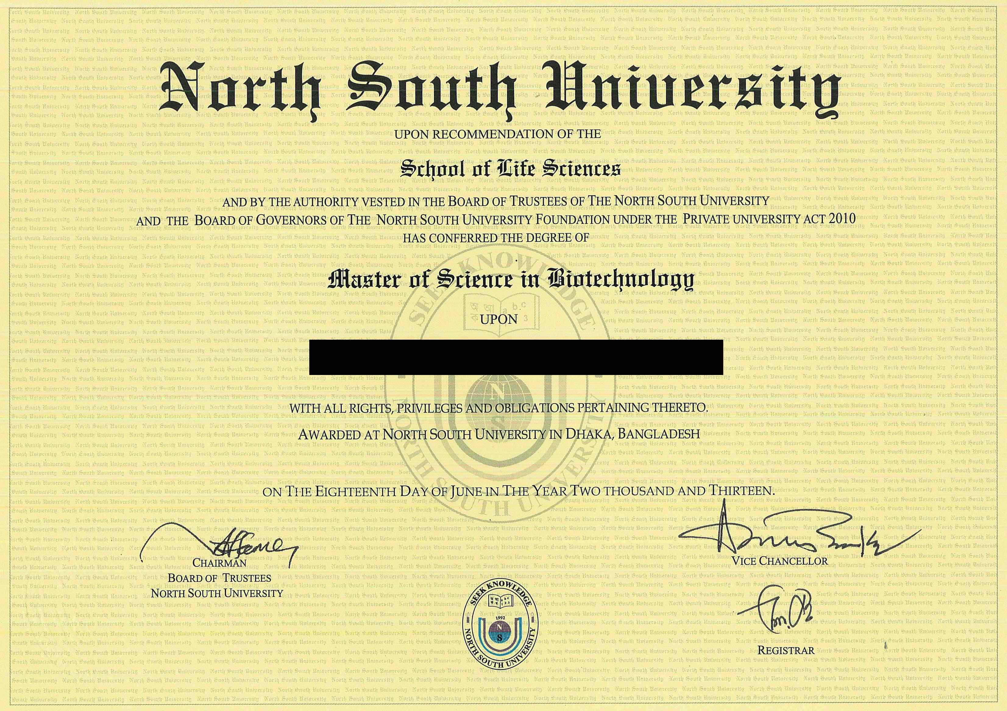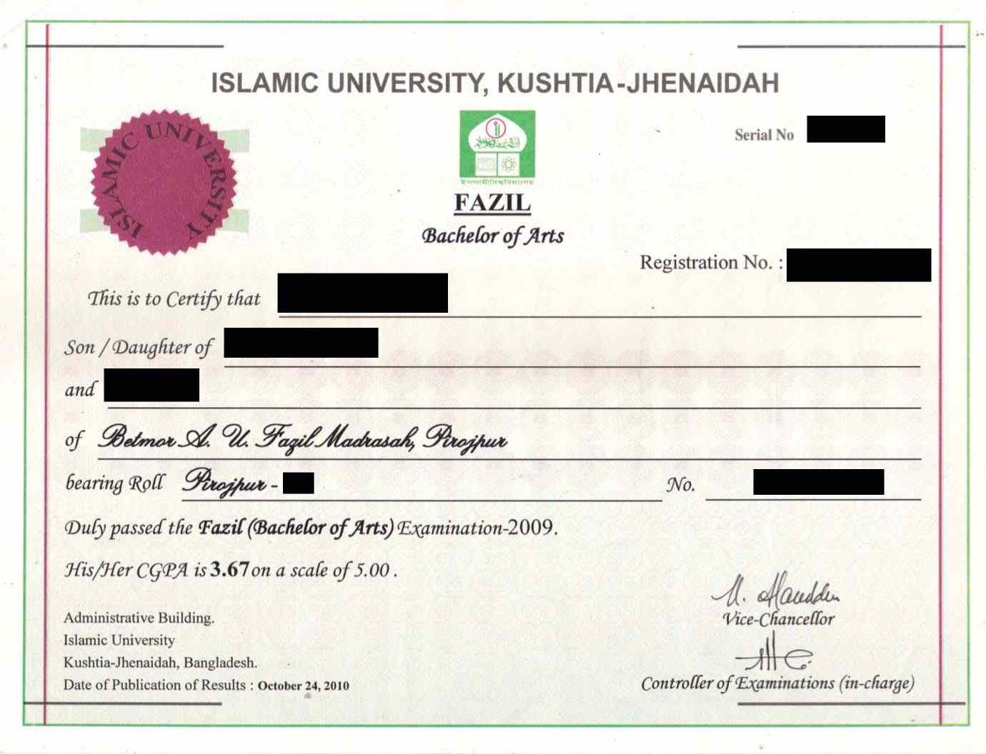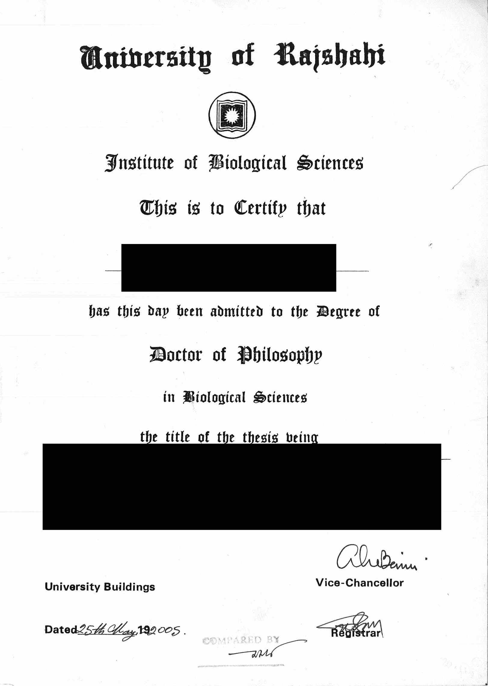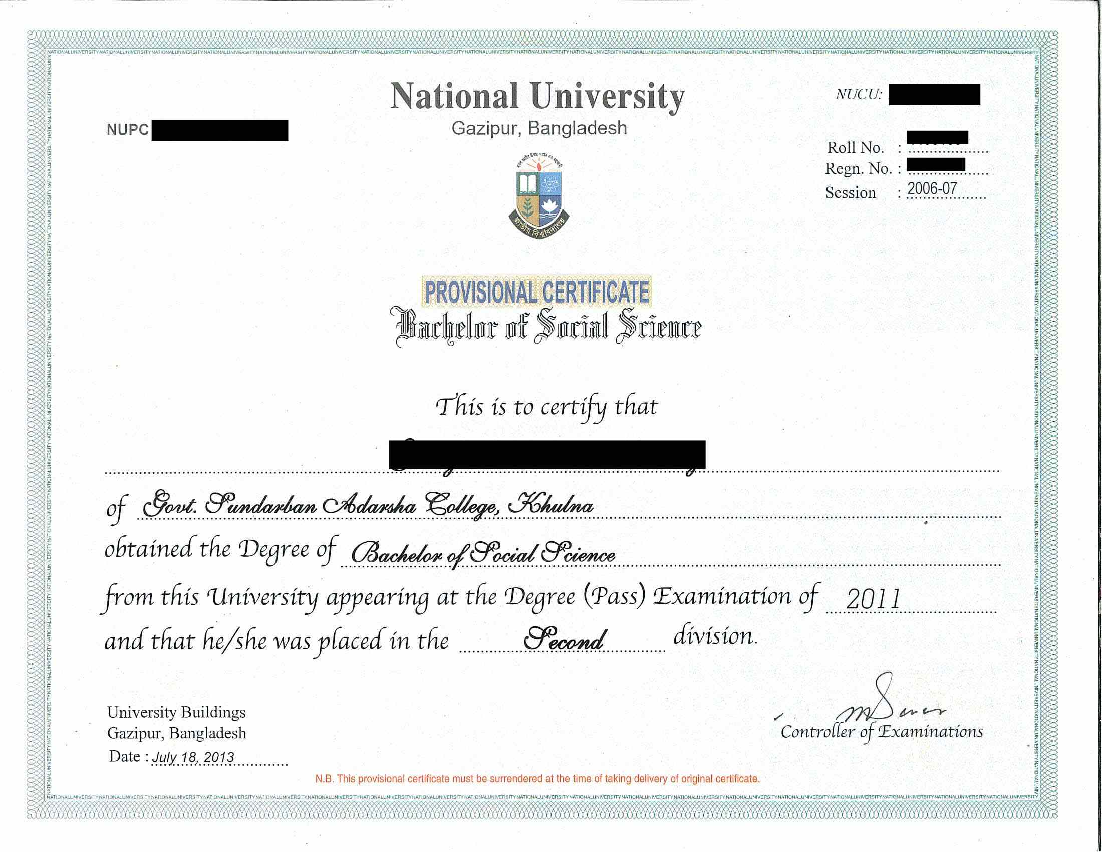 Degree Certificate/Provisional Certificate issued by the University