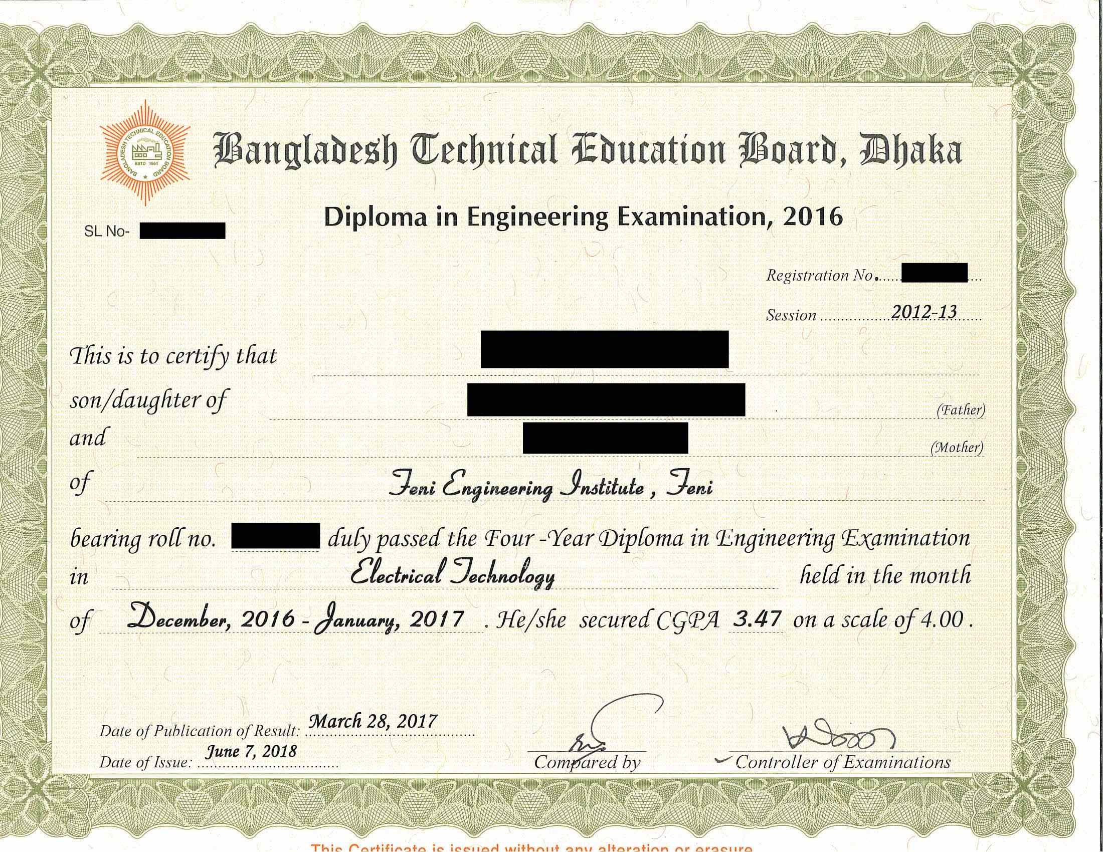 Diploma issued by Bangladesh Technical Education Board