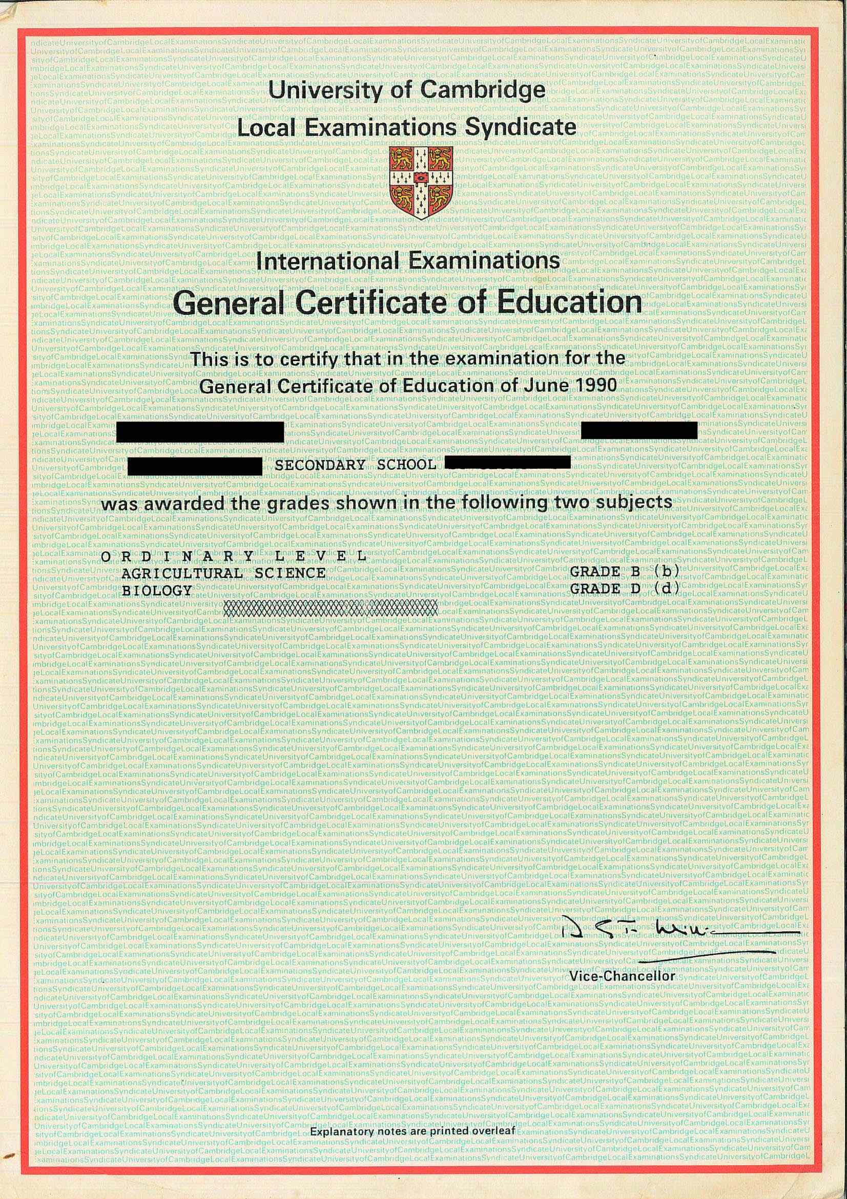 Certificate issued by the University of Cambridge or the University of London