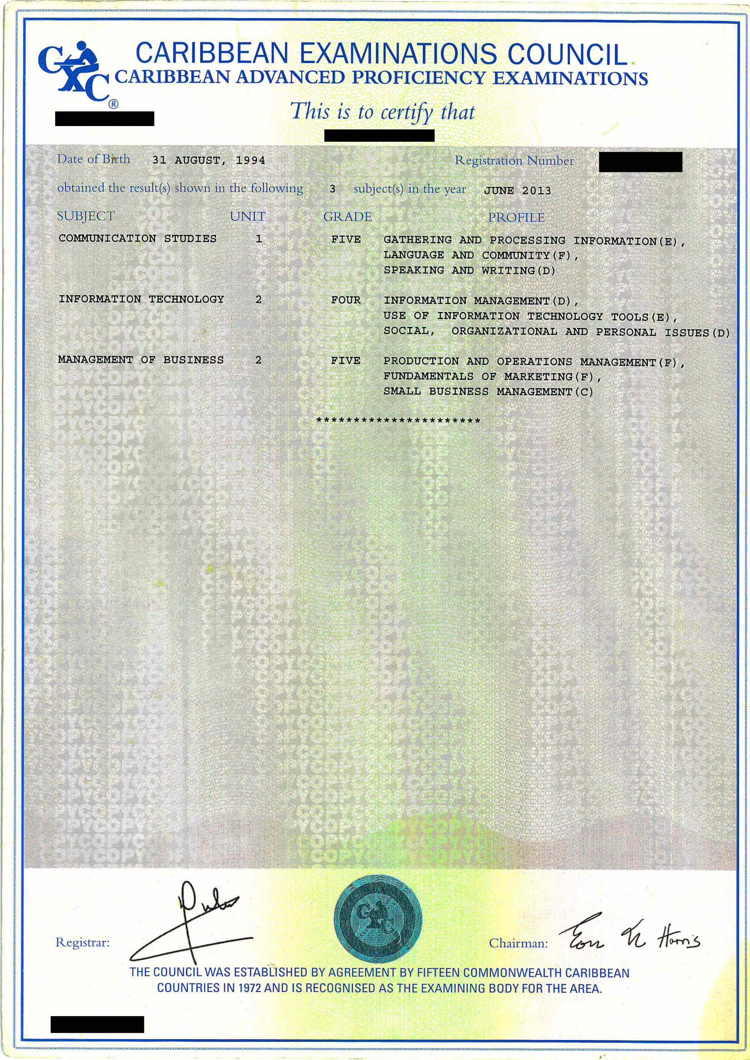 Certificate issued by Caribbean Examinations Council