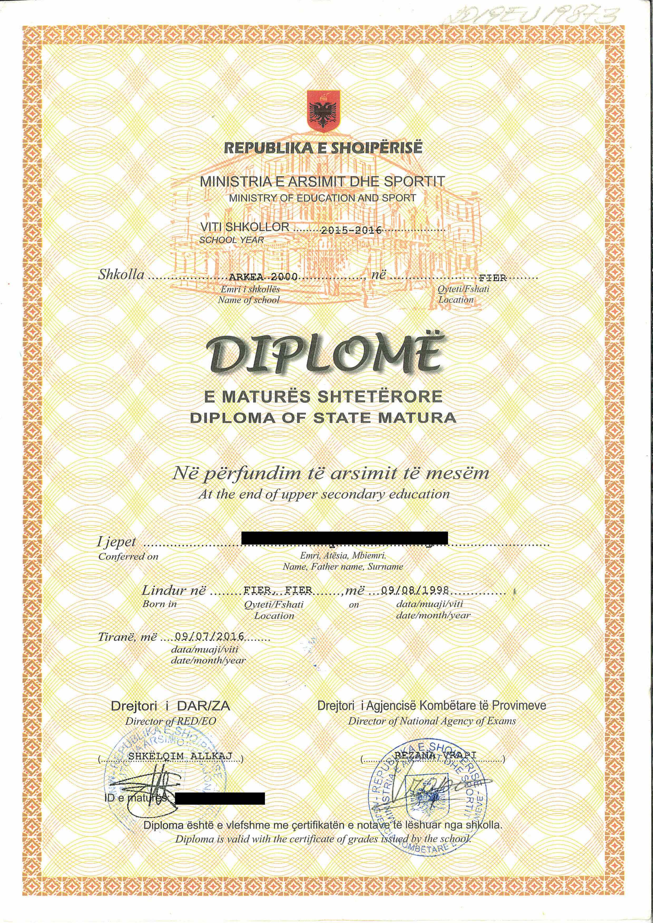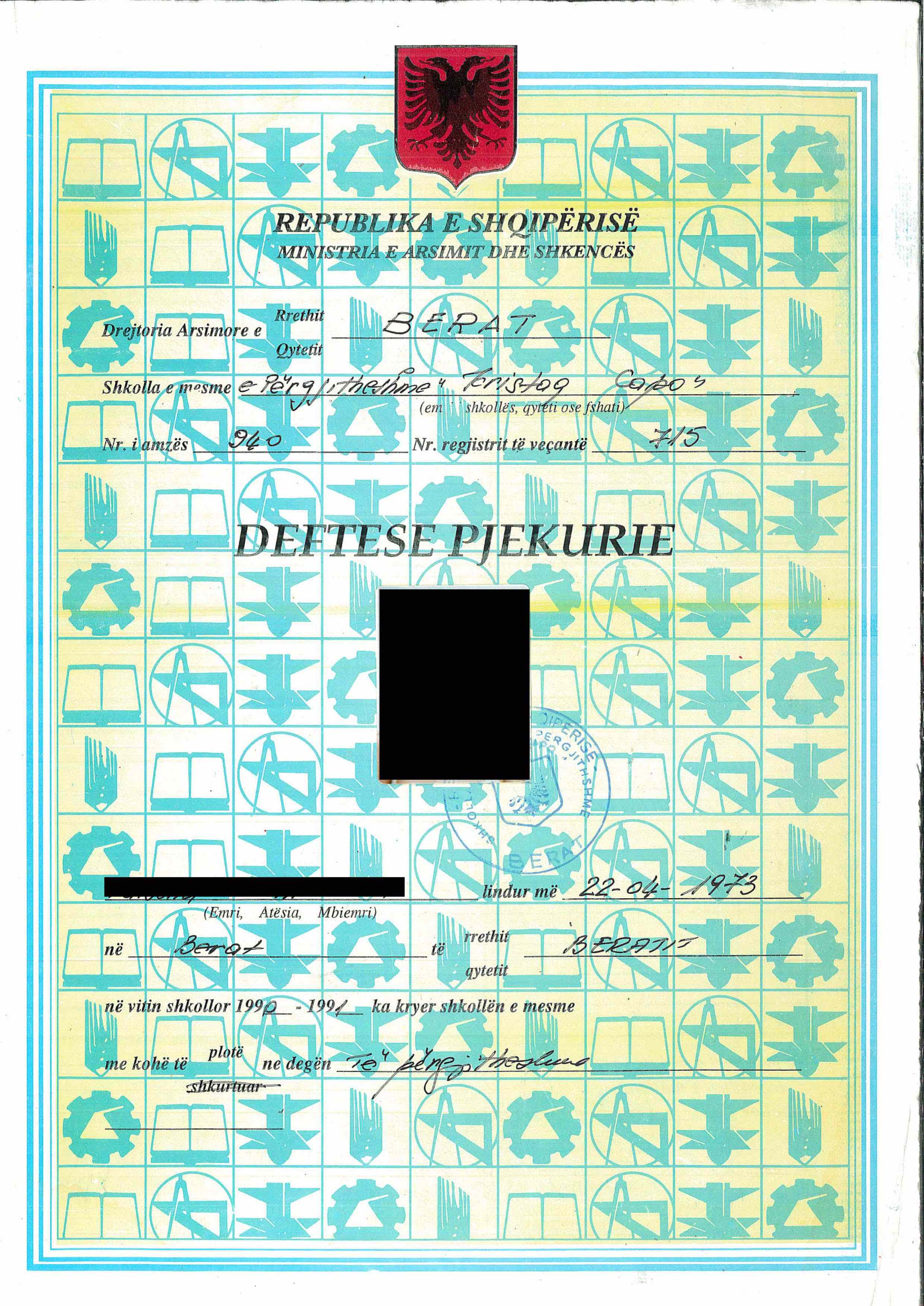 Transcript (Vërtetim Notash) is required as well. Transcript must be issued by the academic institution attended. Certified city archives records are not acceptable.