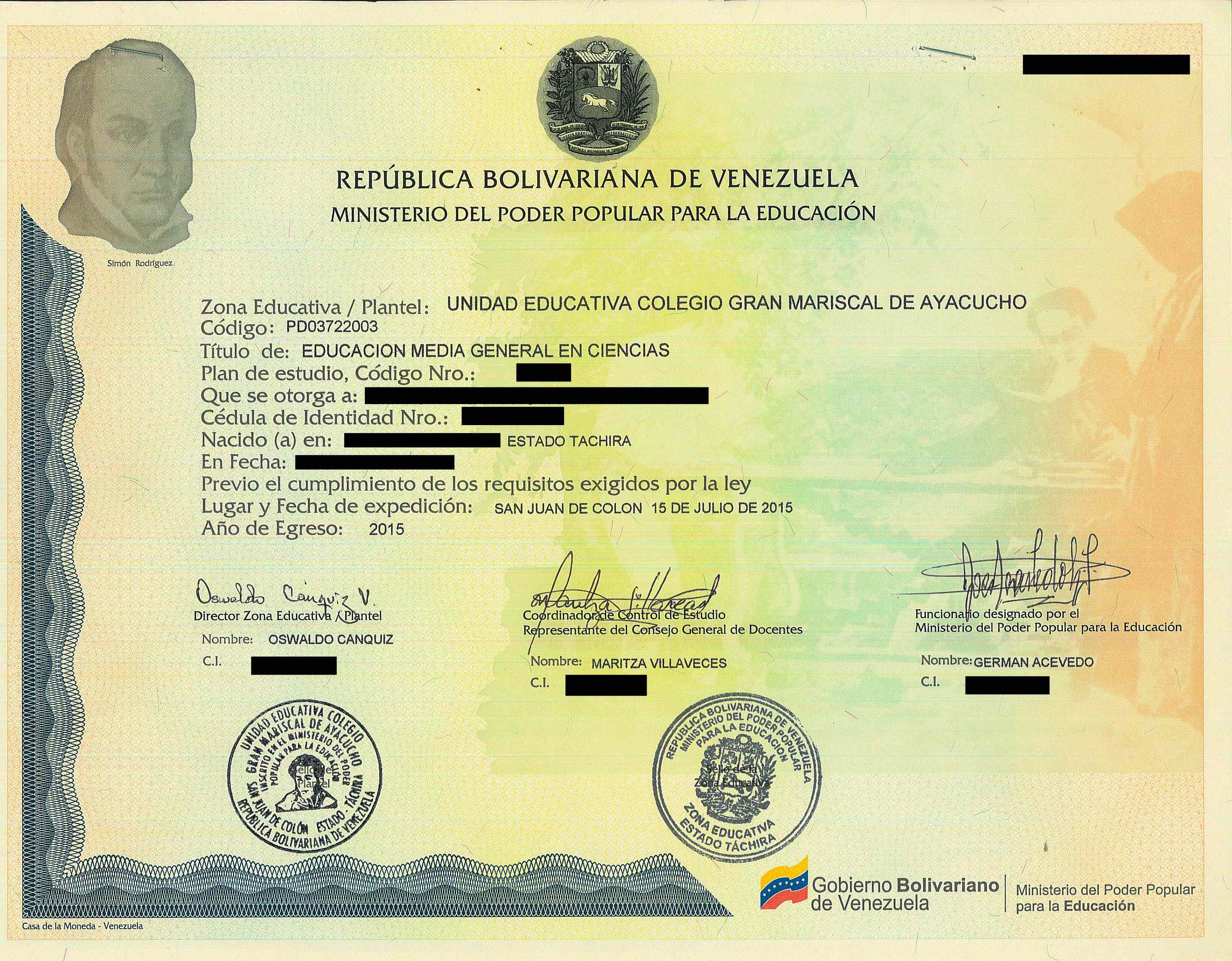 TÃtulo de Educación Media General en Ciencias/Humanidades/Artes