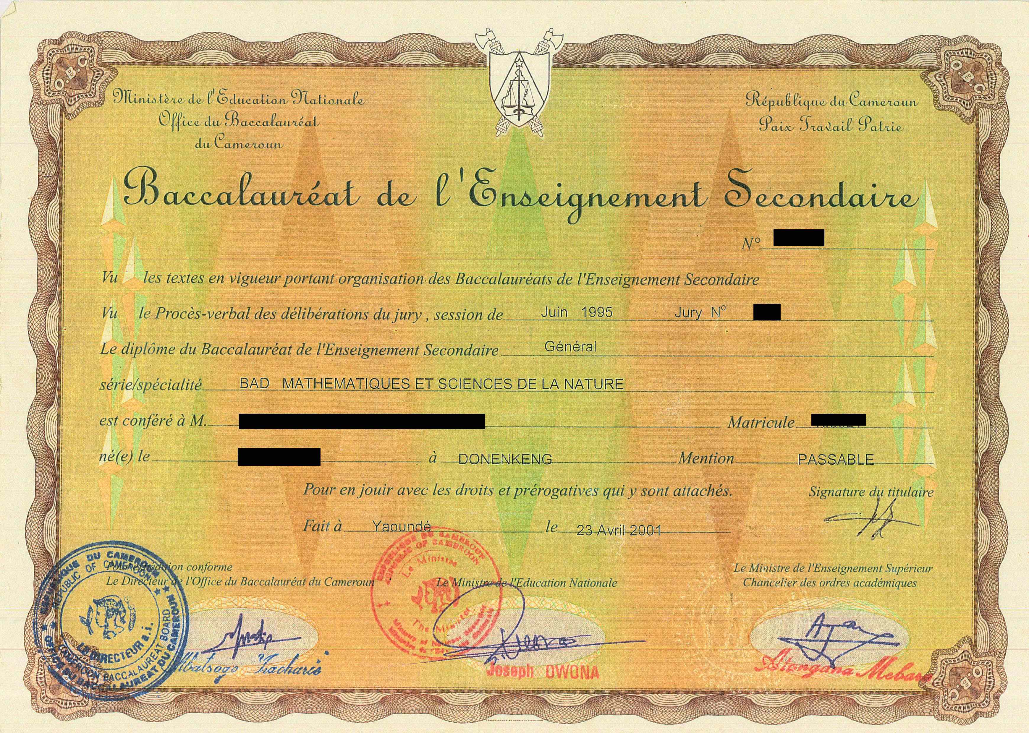 Option 2: Mail or bring your ORIGINAL Baccalauréat / GCE results to our office. The results should be issued by the Cameroon Baccalaureate Office or the Cameroon General Secondary Education Office. (Scans, faxes, photocopies and notarized copies are not considered original documents and cannot be accepted.)