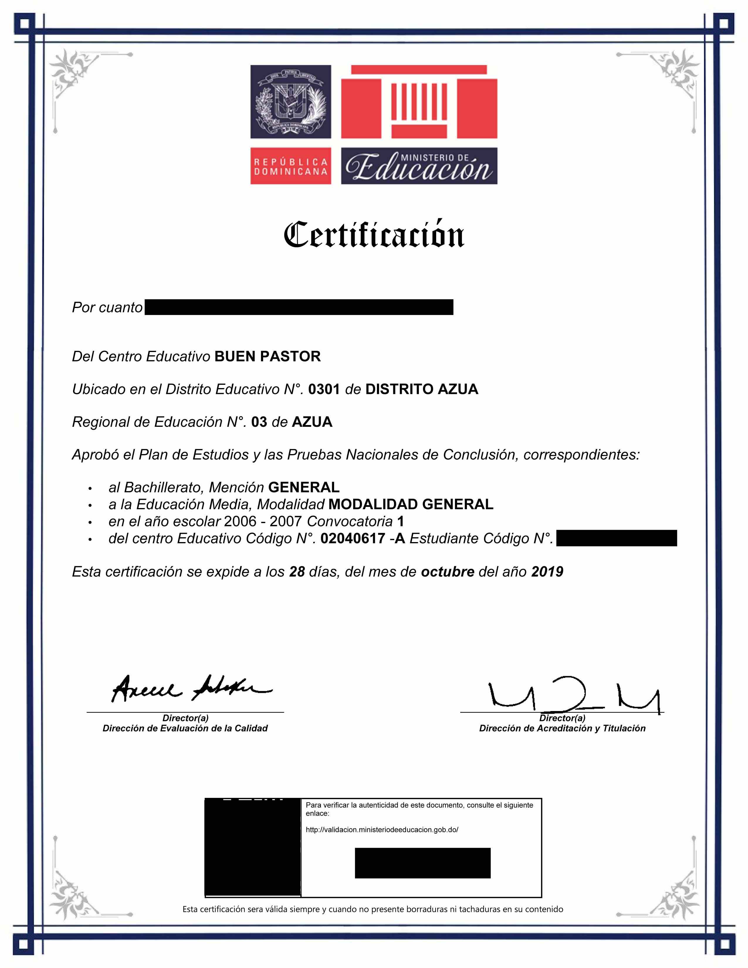 Submit (bring in person or mail) Original Certificate or Diploma that was issued to you at the time of graduation to our office. Transcript / Record of courses and grades (Notas) may be required as well.