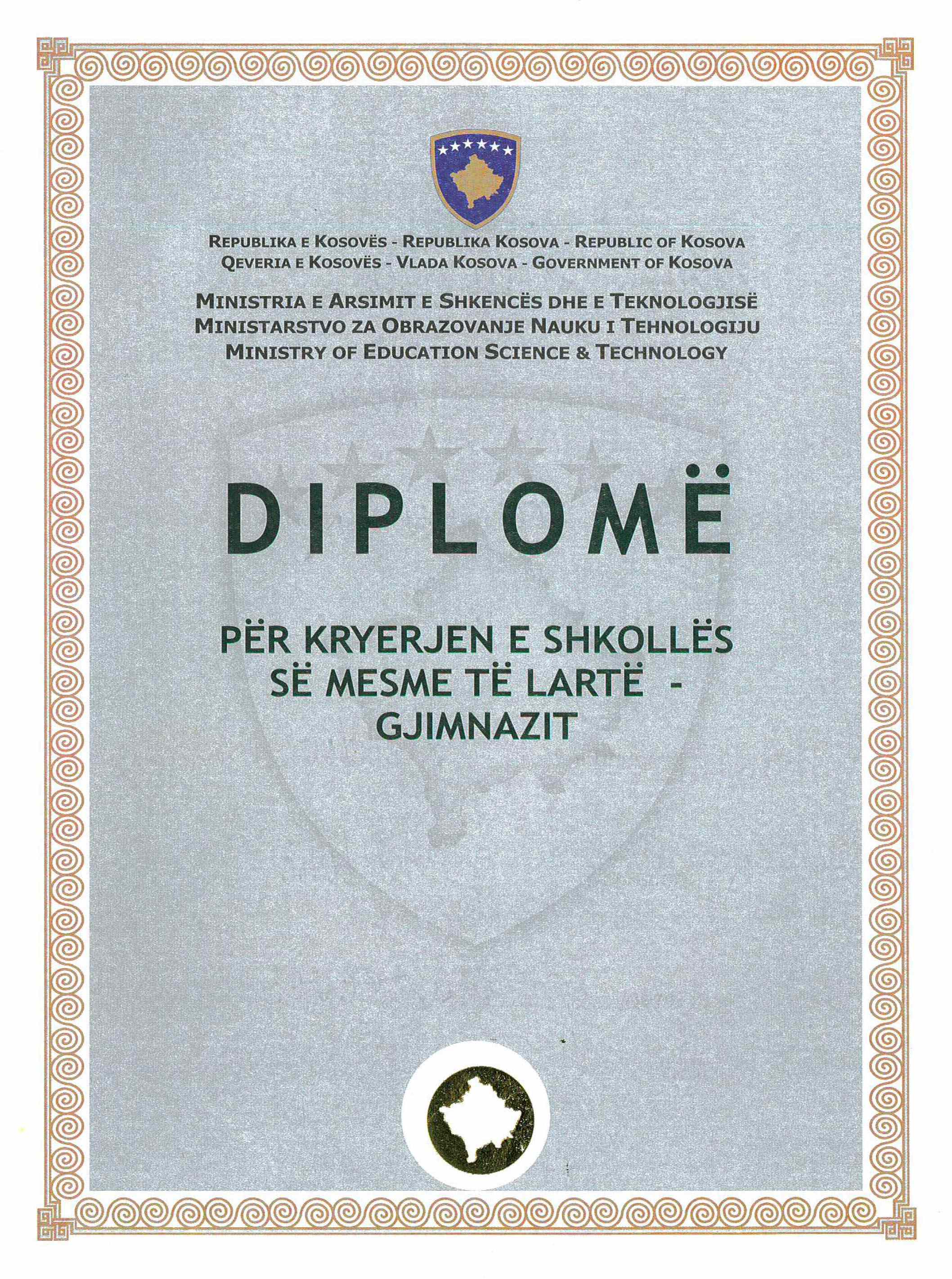 Diplomë për Kryerjen e Shkollës së Mesme të Lartë - Gjimnazit